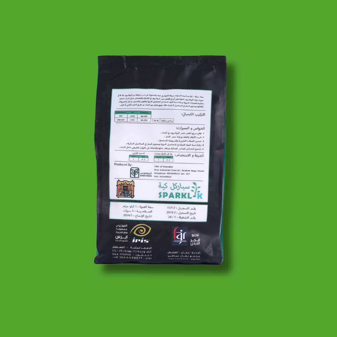 SPARKL-K is a premium potassium fertilizer specially formulated to enhance fruit size, color, and sweetness while improving the plant’s resistance to environmental stress. Potassium plays a key role in water regulation, enzyme activation, and nutrient transport within the plant, ensuring stronger growth and higher yields. Ideal for use during the fruiting and ripening stages for vegetables, fruits, and field crops. Suitable for fertigation or foliar application.