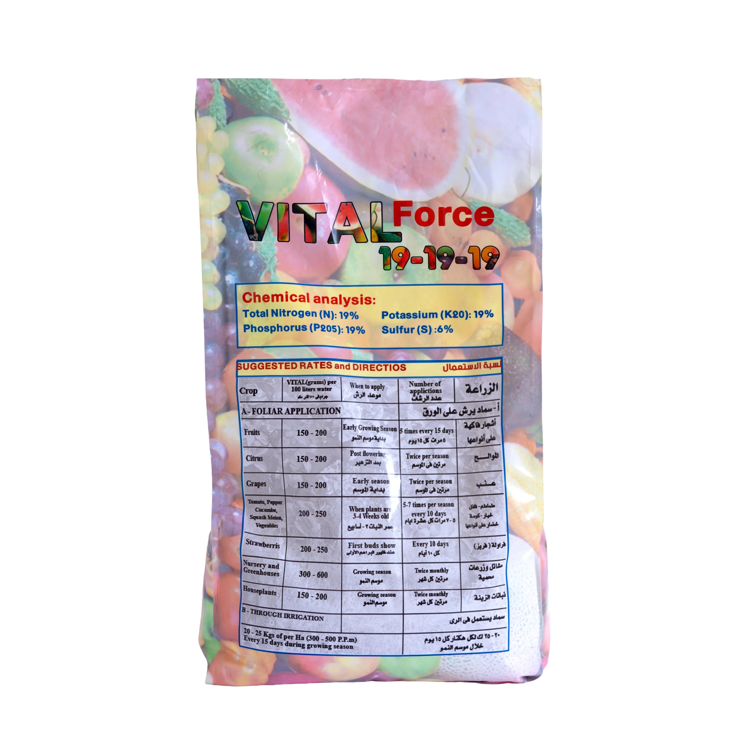Vital Force 19-19-19 is a balanced NPK fertilizer formulated to provide plants with essential nutrients for overall growth and productivity. With equal proportions of nitrogen, phosphorus, and potassium, it supports strong root development, vigorous vegetative growth, and improved flowering and fruiting. Ideal for use on all crops through foliar spray or fertigation systems, ensuring maximum nutrient absorption and healthy plant performance.